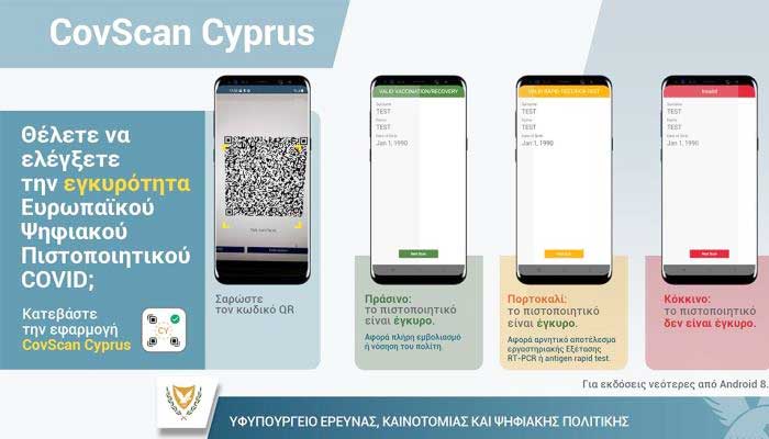 Ο Κανονισμός αναφέρει ότι για σκοπούς ελέγχου στους χώρους στους οποίους η πρόσβαση δυνάμει του παρόντος Διατάγματος προϋποθέτει την επίδειξη, είτε αρνητικής εργαστηριακής εξέτασης ή εξέταση ταχείας ανίχνευσης αντιγόνου για την ασθένεια του COVID-19, είτε πιστοποιητικού ολοκληρωμένου εμβολιαστικού σχήματος, είτε πιστοποιητικού ανάρρωσης από την ασθένεια του COVID-19, τα εν λόγω έγγραφα ή/και πιστοποιητικά ελέγχονται με τη σάρωση του κωδικού QR του Ευρωπαϊκού Ψηφιακού Πιστοποιητικού COVID και ο έλεγχος διενεργείται μέσω της ηλεκτρονικής εφαρμογής “CovScanCyprus”.