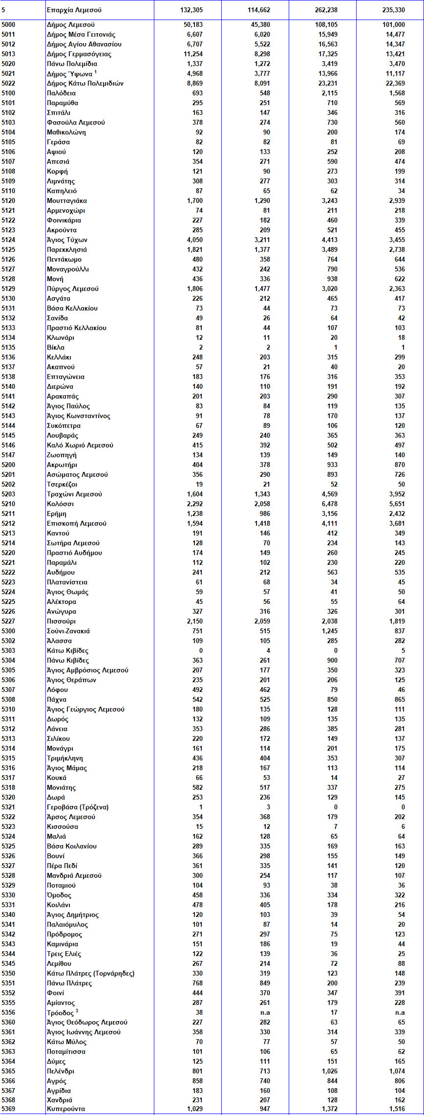 Δήμος Γερμασόγειας τόσο σε κατοικίες όσο και σε πληθυσμό με ποσοστά 35,6% και 29,1% αντίστοιχα (σύνολο κατοικιών 11.254 και πληθυσμού 17.325 άτομα). Σημαντική αύξηση στην αστική Λεμεσού σημείωσε και ο Δήμος Ύψωνα με 31,5% στις κατοικίες και 25,6% στον πληθυσμό (σύνολο κατοικιών 4.968 και πληθυσμού 13.966 άτομα).