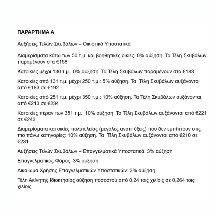 Β) Το 95% των νέων διαμερισμάτων και κατοικιών, που αφορούν κυρίως νεαρά ζευγάρια, καθώς και όλα τα σπίτια σε μισό οικόπεδο ενός επιπέδου, είναι κάτω των 130 τ.μ. και δεν επηρεάζονται από καμία αύξηση. Τα μικρά και μεσαία νοικοκυριά προστατεύονται πλήρως, ενώ οι αυξήσεις είναι ήπιες και κλιμακωτές 5% (8 ευρώ ετησίως) – 10% (21 ευρώ ετησίως), και αφορούν κυρίως μεγαλύτερα και πολυτελή υποστατικά. (Παράρτημα Α)