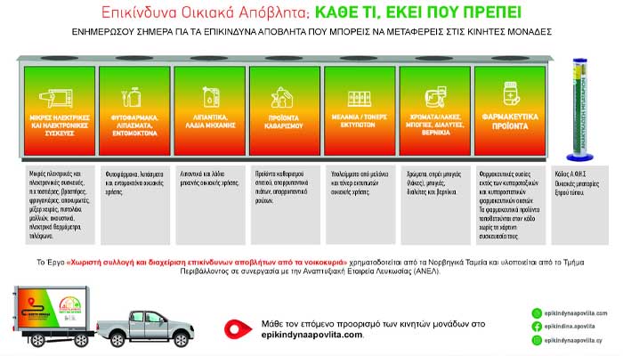 Ο Δήμος Λευκωσίας πληροφορεί το κοινό ότι η κινητή μονάδα ενημέρωσης για τη διαχείριση των επικίνδυνων οικιακών αποβλήτων θα επανατοποθετηθεί στο κέντρο της πρωτεύουσας και συγκεκριμένα στο άνοιγμα των πεζόδρομων Λήδρας – Ονασαγόρου από τις 19 μέχρι και τις 23 Φεβρουαρίου 2024.