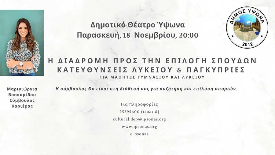 Πληροφορίες στο 25395600 (εσωτ. 8 ή μέσω email: cultural.dep@ipsonas.org)