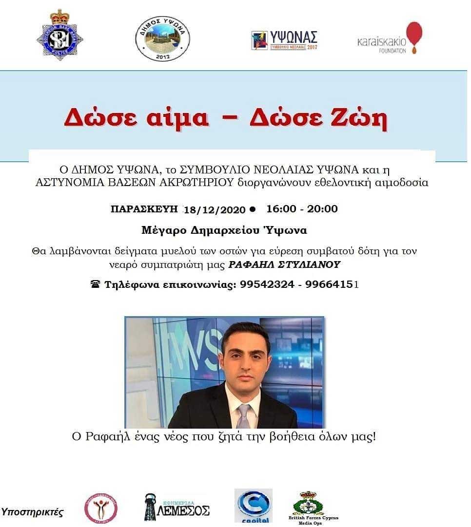 Θα λαμβάνονται δείγματα μυελού των οστών για εύρεση συμβατού δότη για τον συμπατριώτη μας Ραφαήλ Στυλιανού.