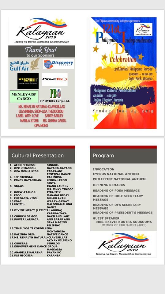 Την Κυριακή 23 Ιουνίου 2019 θα πραγματοποιηθούν οι εορτασμοί για την 121η Ημέρα Ανεξαρτησίας των Φιλιππίνων στη Λευκωσία, την οποία διοργανώνουν οργανώσεις της κοινότητας των Φιλιππινέζων από όλη την Κύπρο σε συνεργασία με το Γραφείο Εργασίας Εξωτερικού των Φιλιππίνων.