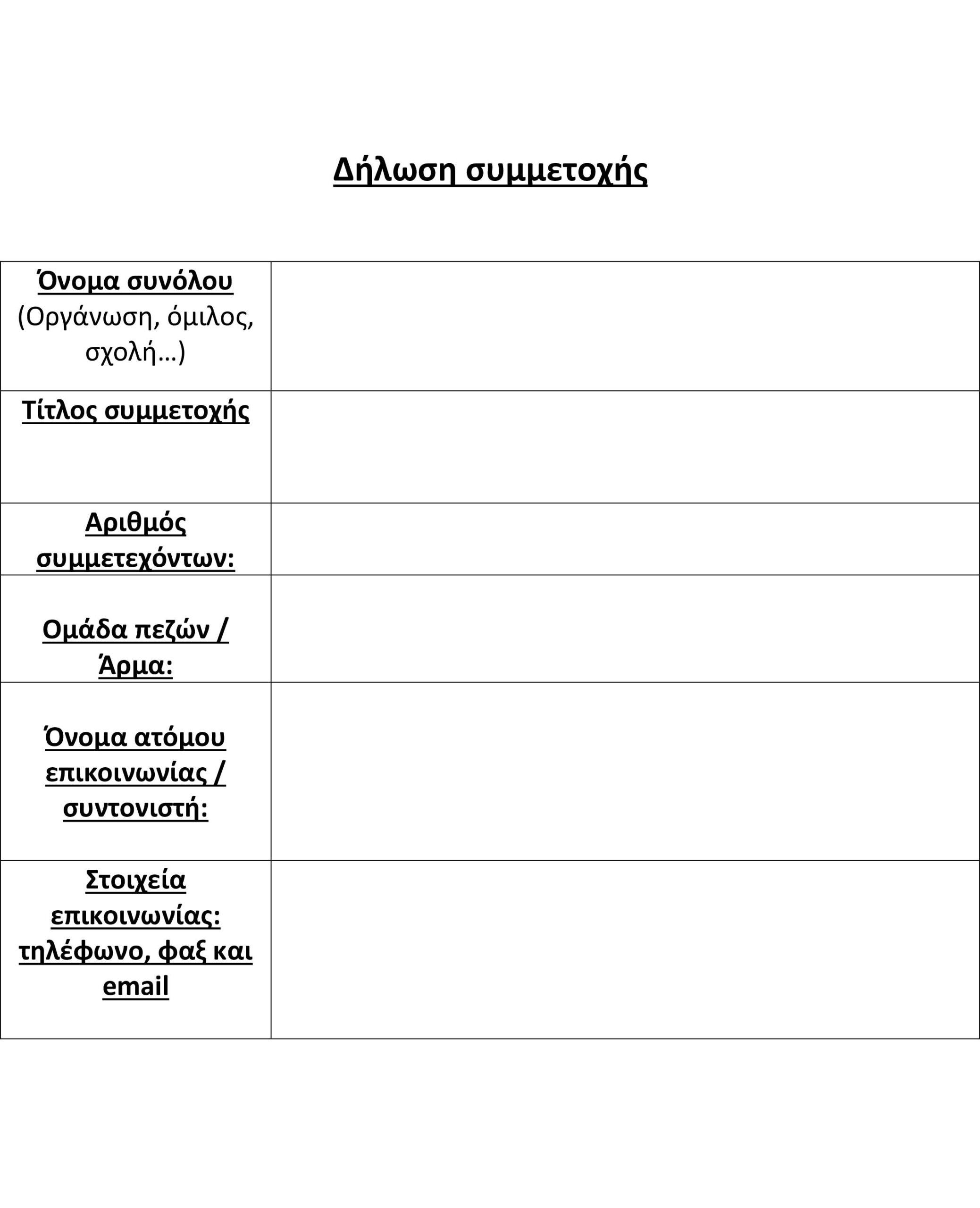 Όσοι ενδιαφέρονται να λάβουν μέρος, θα πρέπει να συμπληρώσουν την πιο κάτω δήλωση συμμετοχής. Για απορίες επικοινωνήστε με τις Πολιτιστικές Υπηρεσίες του Δήμου στα τηλέφωνα 24657745 και 24629333.