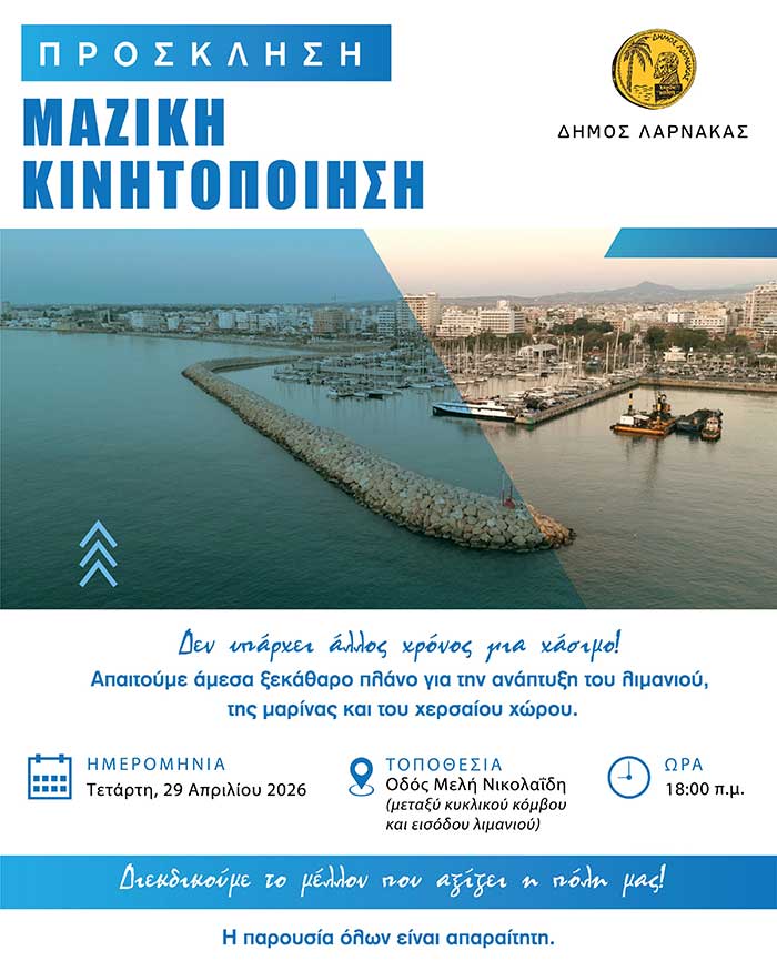 Σε θέση μάχης εισέρχεται η Λάρνακα για το ζήτημα της ανάπτυξης λιμανιού και μαρίνας, με τους τοπικούς φορείς να προχωρούν σε κινητοποίηση την Τετάρτη (29/04) στις 18:00, έξω από το λιμάνι, στέλνοντας μήνυμα ότι η ανοχή απέναντι σε καθυστερήσεις και ασάφειες έχει εξαντληθεί.