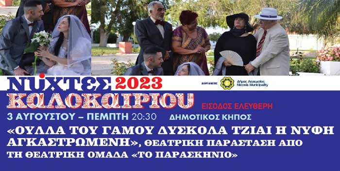Οι Νύχτες Καλοκαιριού 2023 συνεχίζουν τον Αύγουστο με θεατρική παράσταση “Ούλλα του γάμου δύσκολα τζαι η νύφη αγκαστρωμένη” από το θέατρο “Το Παρασκήνιο” την Πέμπτη 3 Αυγούστου στις 8:30 το βράδυ στον Δημοτικό Κήπο Λευκωσίας.