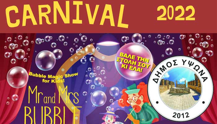 Την Παρασκευή 4 Μαρτίου στις 19:00 ο Δήμος Ύψωνα φιλοξενεί στο Δημοτικό Θέατρο Ύψωνα τους Mr and Mrs Bubble. Δύο πλάσματα, από άλλη εποχή, που ζουν στον περιπλανώμενο πλανήτη Σαπουνόφουσκα. Ταξιδεύουν και ανοίγουν το σπιτικό τους για να μοιραστούν με τους καλεσμένους τους τη χαρά του να ζεις εδώ και τώρα, όπως μία σαπουνόφουσκα.